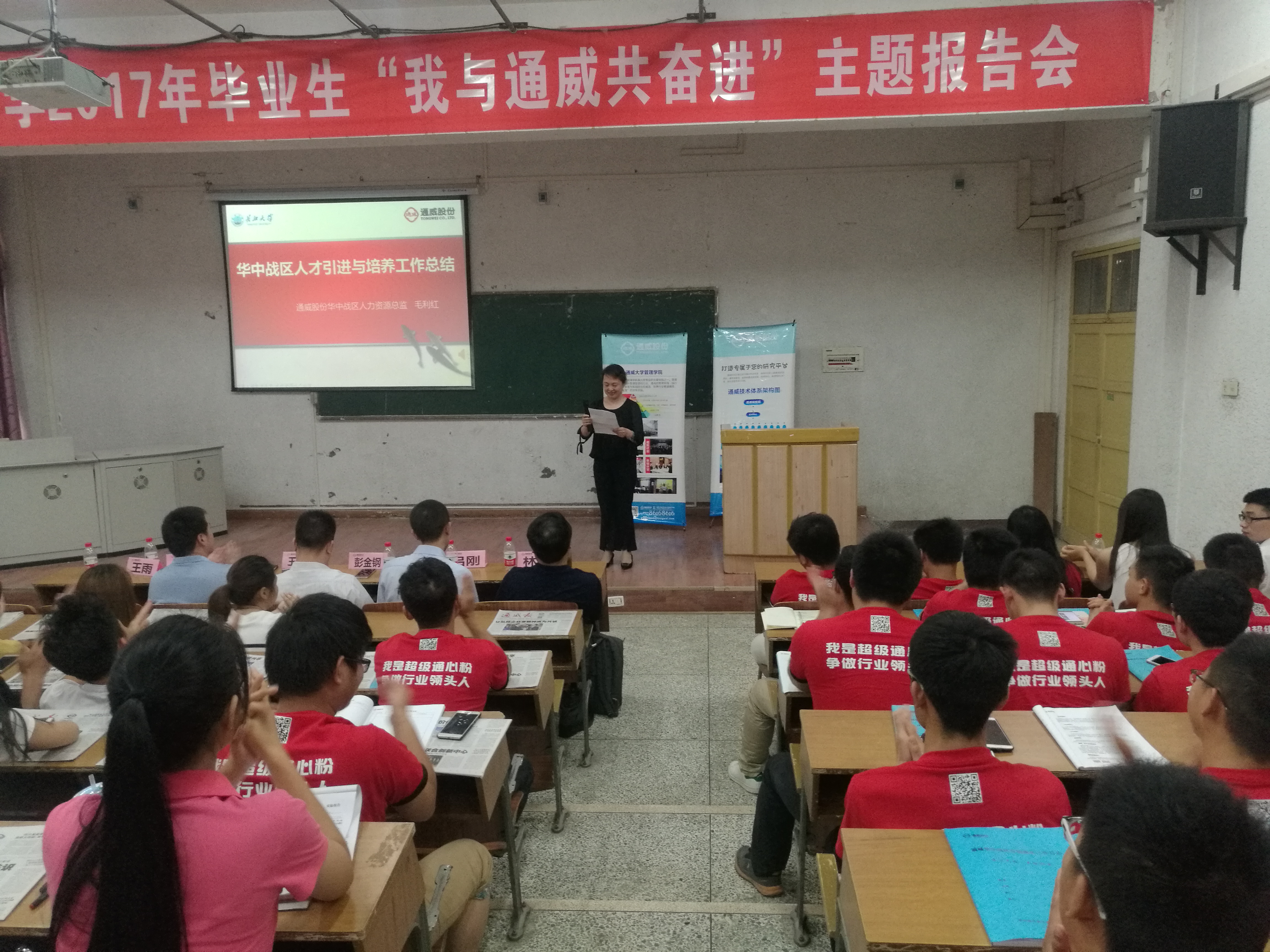 (通讯员 余平杨秋凤) 校企合作,共育英才。5月20日下午2时许,16877太阳集团安全入口2017年毕业生“我与通威共奋进”主题报告会在五教203顺利举行,出席此次大会的有动科院党委书记王凌华、党委副书记王雨、通威集团华中片区畜禽技术总监吕刚、华中片区人力资源总监毛利红、武汉通威饲料有限公司总经理彭金刚、沙市通威总经理林涛,16877太阳集团安全入口200多名学生参加了报告会。